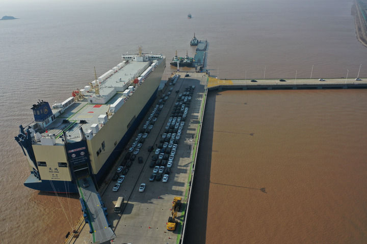 一艘滚装船停靠在浙江宁波舟山港梅东码头,装运的汽车从船内驶出(2022年12月13日摄,无人机照片)。新华社记者 黄宗治 摄