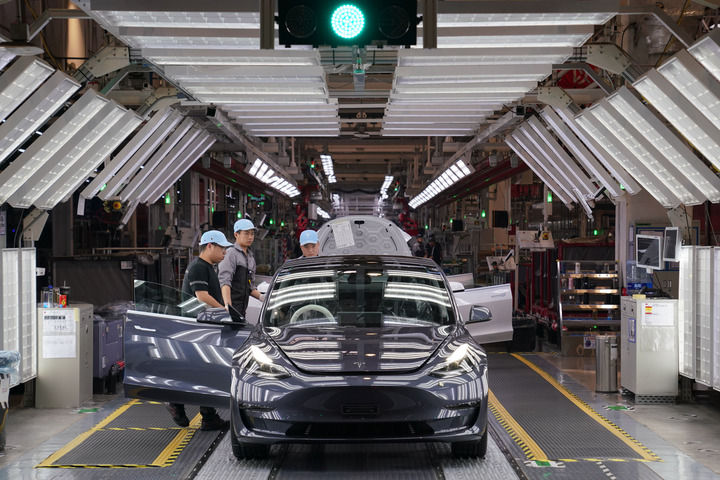 工作人员在特斯拉上海超级工厂总装车间生产线上作业(2023年5月12日摄)。新华社记者 马宁 摄