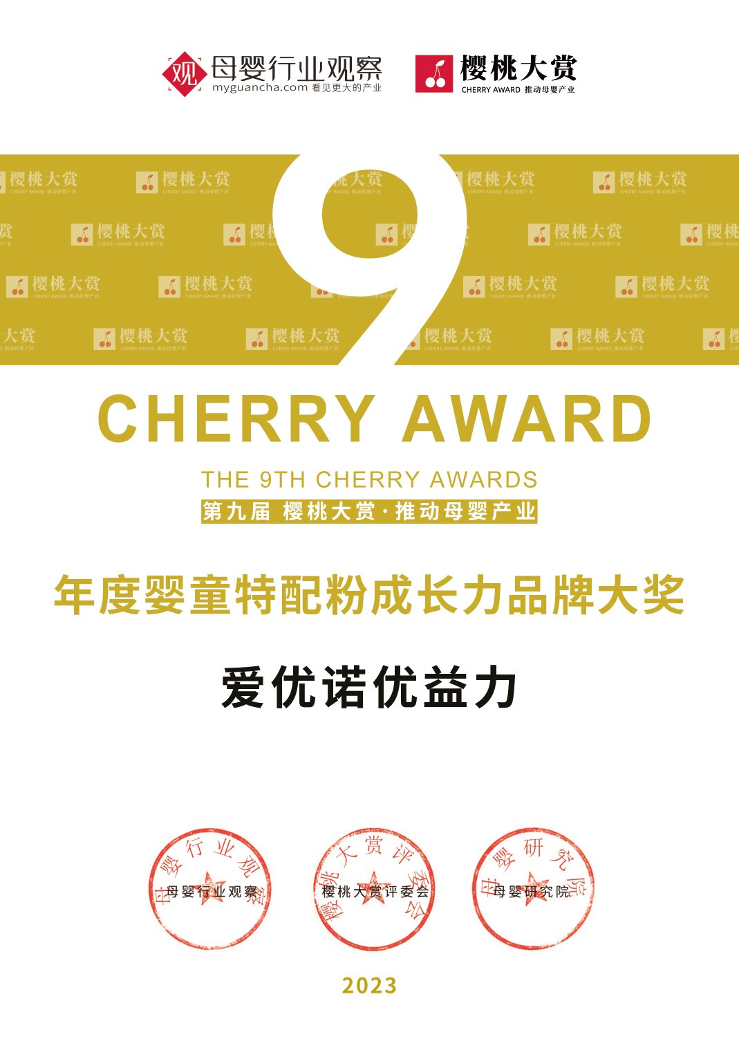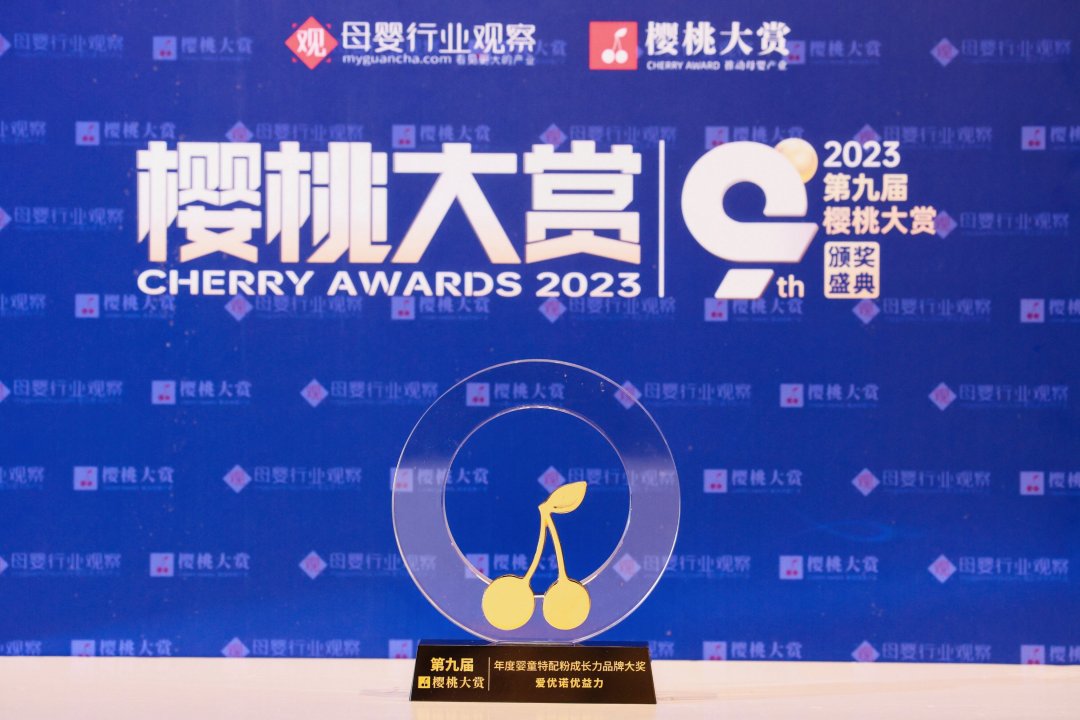 1月11日,由母婴行业观察主办的“专业创造价值·2023第九届樱桃大赏年度盛典”于上海盛大开幕。近百位行业的企业领袖、业内翘楚及资深大咖出席盛会,共谋行业发展,实现资源对碰,并一同见证荣耀时刻。爱优诺凭优益力凭借出色的产品力和创新力,从众多产品中脱颖而出,斩获“年度婴童特配粉成长力品牌大奖”。