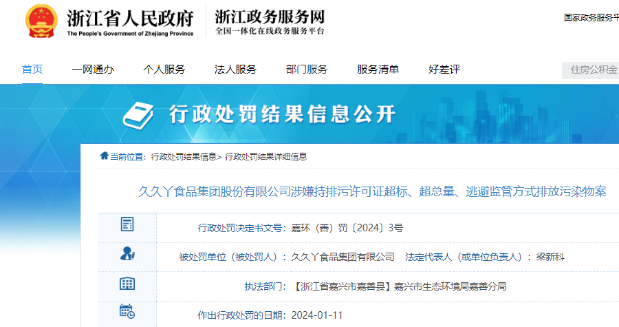 (记者 叶加)近日,久久丫食品集团股份有限公司因超排污许可证许可浓度排放水污染物,被嘉兴市生态环境局嘉善分局罚款20万元,处罚日期为2024年1月11日。