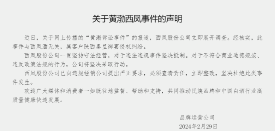 对此,西凤酒股份发布声明称,关于网上传播的“黄渤诉讼事件”的报道,西凤股份公司立即展开调查。经核实,此事件与西凤酒无关,属客户陕西秦皇御宴侵权纠纷,已向违规经销公司提出严正要求,必须查清责任,立即整改,坚决杜绝此类事件发生。