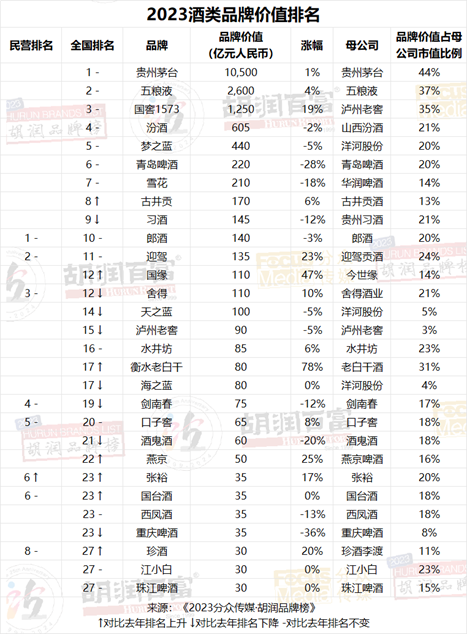 值得注意的是,近日《2023胡润品牌榜》发布,西凤酒在酒类品牌价值排名中排名第二十三,品牌价值35亿元,跌幅13%,落后于同期过百亿的今世缘(52.430, -1.07, -2.00%)。