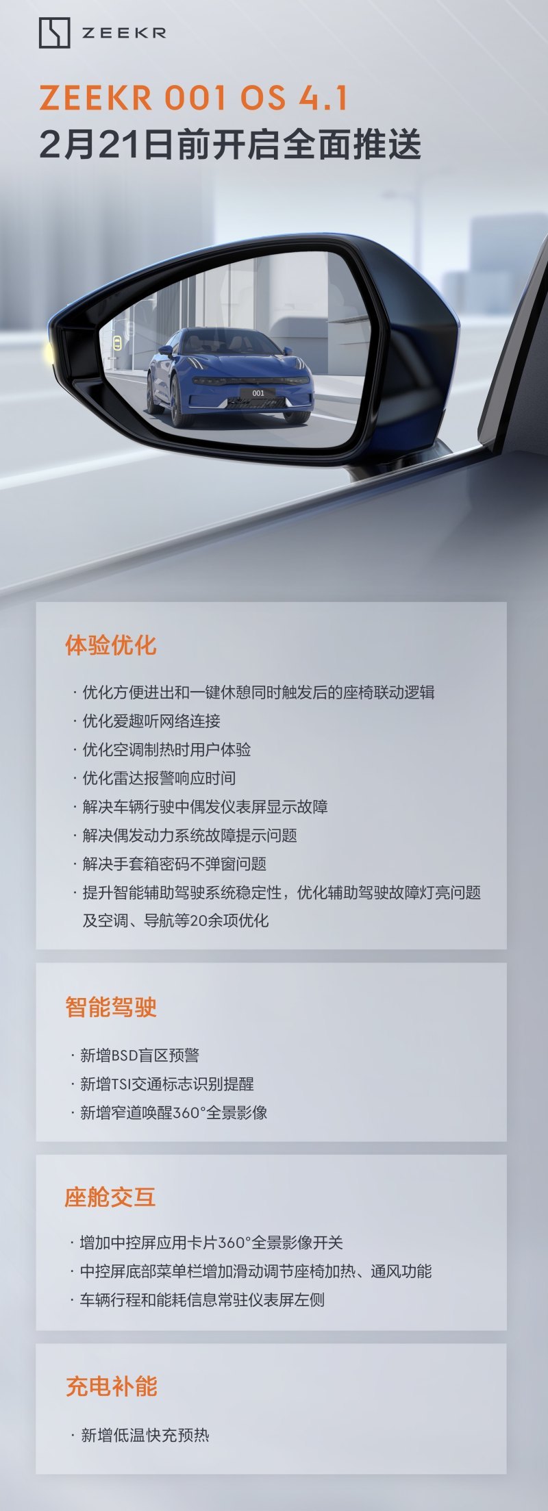 同日,极氪官方宣布,极氪001搭载的ZEEKR OS 4.1将于2月21日前开启全面推送,对体验、智能驾驶、座舱交互、充电补能方面进行升级。
