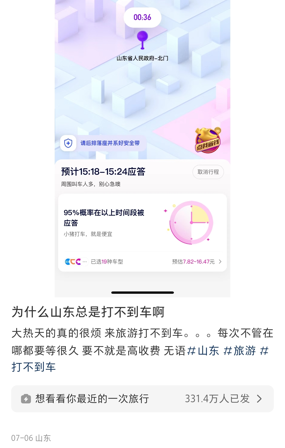 值得一提的是,在曾发布网约车行业风险预警通知且称网约车市场运力已基本饱和的山东济南,同样有网民反映“为什么山东总是打不到车”。该网友表示,每次不管在哪里都要等很久,要不就是高收费。