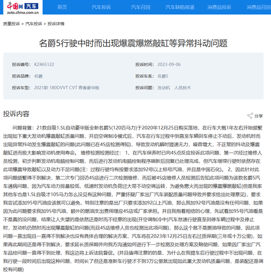 近日,中国投诉-全国缺陷产品投诉平台收到名爵5车主杨先生关于车辆发动机出现爆震敲缸故障,4S店处理多次无法解决的投诉。