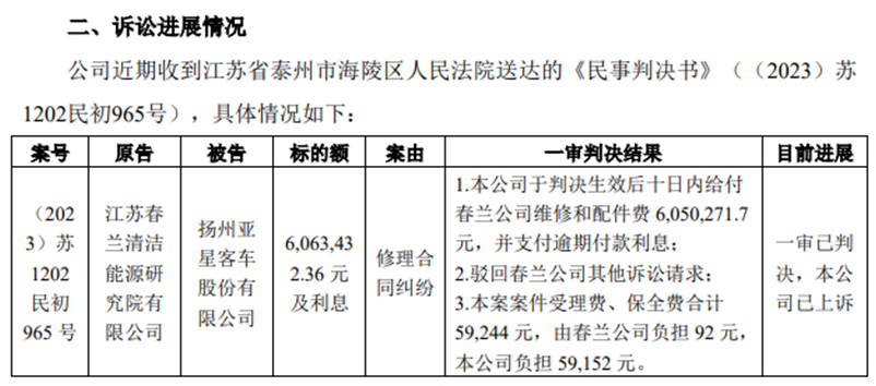 与此同时,9月15日晚亚星客车的另外一份公告却显示,亚星客车因修理合同纠纷被江苏春兰向泰州市海陵区人民法院提起诉讼,一审判决结果为亚星客车给付江苏春兰维修和配件费606.3万元及利息。一审判决后,亚星客车继续提起上诉。