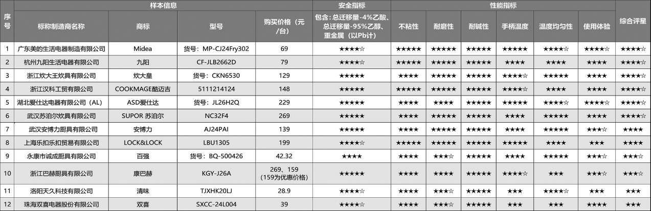 安全性方面,本次比较试验的12款不粘锅样品的总迁移量-4%乙酸、总迁移量-95%乙醇、重金属(以Pb计)等3个安全项目全部符合要求。