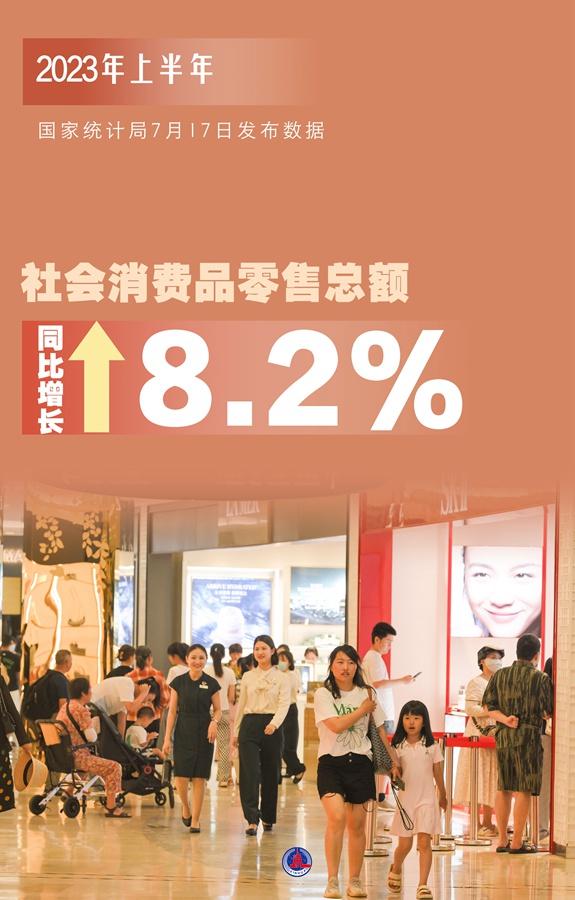 (周圆、张树志)国家统计局17日发布数据显示,上半年,市场销售增势较好,社会消费品零售总额227588亿元,同比增长8.2%,比一季度加快2.4个百分点。