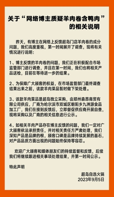 9月5日讯(记者 乔漪)针对网络博主曝光巴奴旗下“超岛自选火锅(以下简称‘超岛’)”高钙羊肉卷检出鸭成分一事,今日,超岛在其官方公众号发布相关说明,称公司正积极配合市场监管部门进行调查,并第一时间将相关产品送检,目前等待进一步结果。同时,为保障顾客权益,超岛决定在市场监管部门最终调查结果出来之前,对涉事羊肉菜品做暂时下架处理。