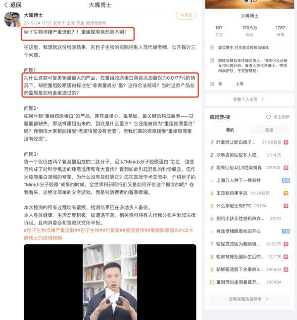 5月24日,美妆博主“大嘴博士”发文《巨子生物疑似造假?!重组胶原竟然测不到胶原!》。