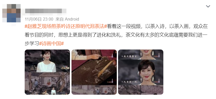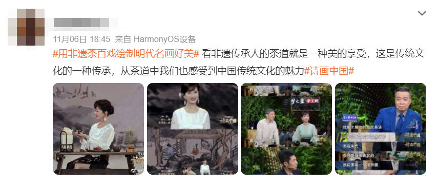 节目播出后,相关舞台片段及话题#用非遗茶百戏绘制明代名画好美#迅速登陆微博热搜热榜,引发网友热议。有网友感慨:“节目仿佛用一盏茶就带着我们穿越时空,和古代文人来了一场跨越千年的对话。”更有网友对于此种表现方式表示认可,认为通过这样的方式宣传非遗文化,更容易让年轻人接受和认可,提升大家的文化自信。