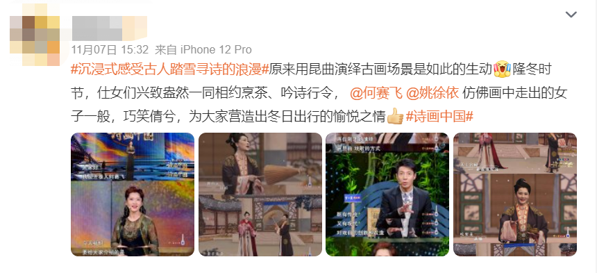 何赛飞与姚徐依的生动演绎收获了全网好评,相关舞台片段及话题#沉浸式感受古人踏雪寻诗的浪漫#相继登上各大社交平台热搜热榜。“何赛飞、姚徐依的吟唱让我身临其境,古诗画与昆曲艺术的相容实在是太奇妙了!”还有不少网友被古人的浪漫所感染,发出“我也想围炉赏雪、吟诗唱歌”的感慨,更感受到了昆曲的魅力。