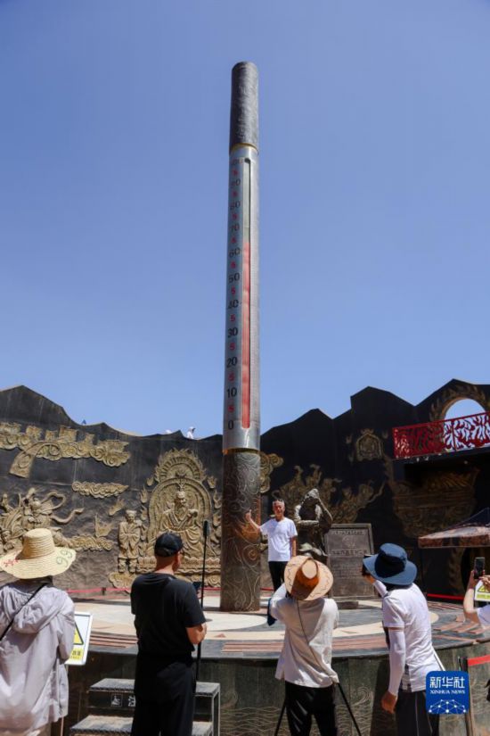 游客在位于吐鲁番市的火焰山景区游玩(6月27日摄)。巨型温度计显示当时火焰山景区地表温度约为65摄氏度。
