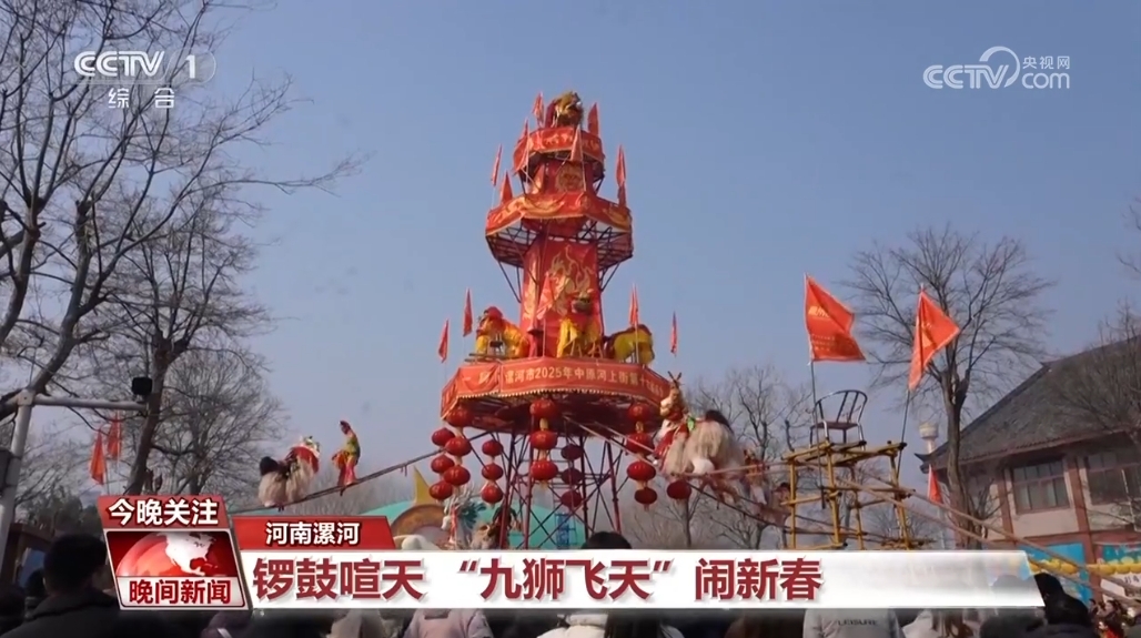 百狮齐舞迎新春,在河南漯河,一场非遗表演“九狮飞天”热闹上演。只见舞狮者脚踩空中绳索,跳跃、腾空,在17米高的“通天塔”上展开了一场狮王争霸赛。精彩的表演引得观众连声叫好。