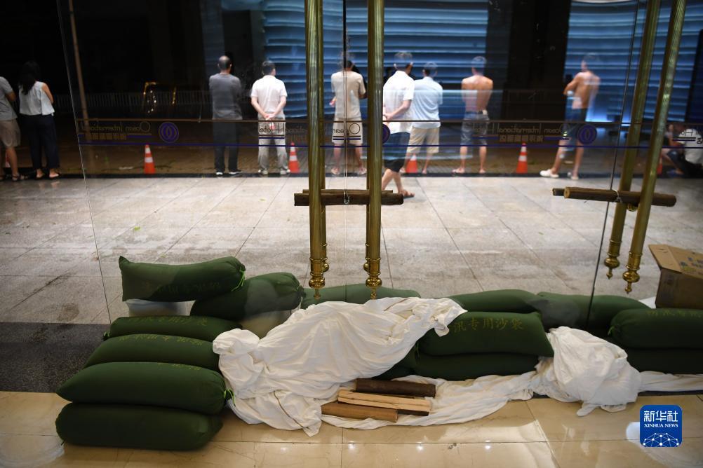 7月17日晚,在广东湛江海滨大道北一处酒店,门口堆放着防汛沙袋。新华社记者 邓华 摄