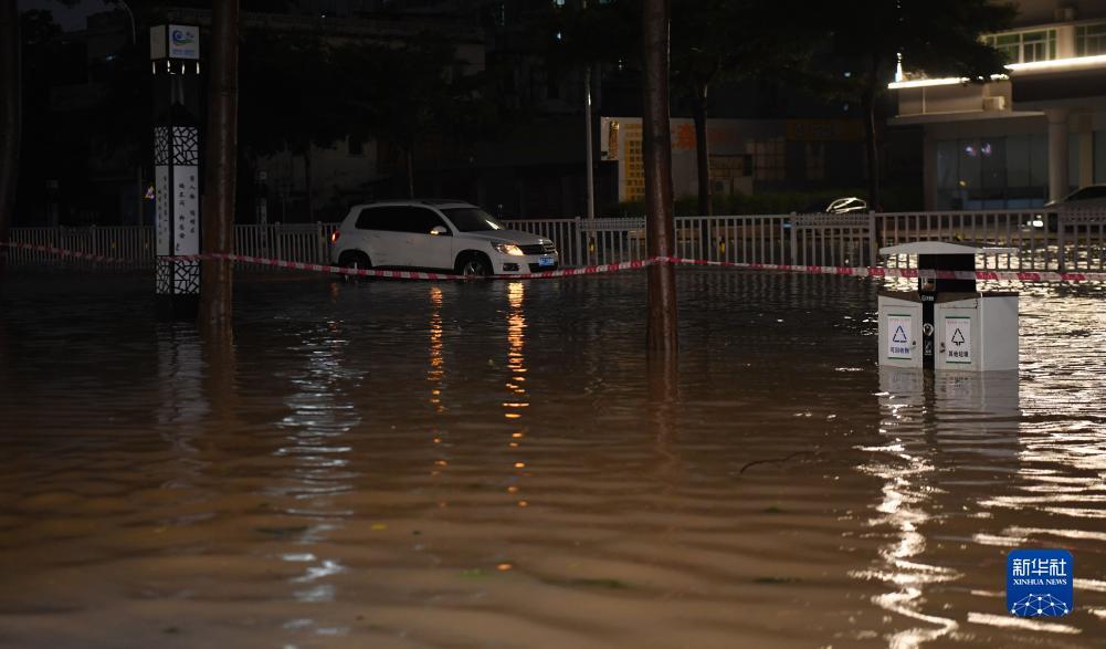 7月17日晚,在广东湛江海滨大道北,车辆由于道路积水被困。当日,据中央气象台监测,今年第4号台风“泰利”的中心已于22时20分前后在广东省湛江市南三岛沿海登陆,登陆时中心附近最大风力为13级。新华社记者 邓华 摄